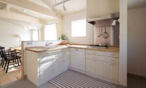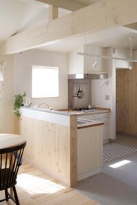 キッチンで作業をしていても家族と繋がりを持てるリビング・ダイニングとして、家事最中もご家族の様子を確認出来るように設計しました。