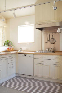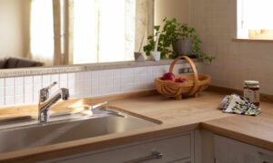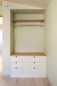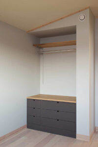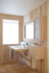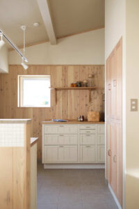 オリジナルの収納家具やナラ天板のキッチン等、北の住まいの表現を随所に使わせて頂いています。キッチンのナラ天板は、使い込むほどに味わい深まる樹の天板ですが、作業台ということで、採用には少し勇気が必要だったことと思います。しかし、数カ月後に使い心地を伺ってみると、柔らかな木の天板はとても使いやすいそうで、濡れた洗い物など普通に置くこともあるそうですが、全く分からない綺麗な状態とのこと。定期的にメンテナンスする事で、いつまでも使い続けられる素晴らしいキッチン天板になりました。