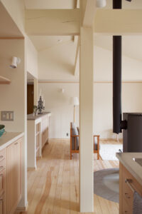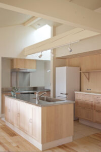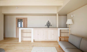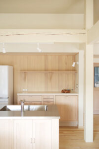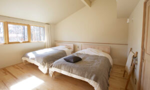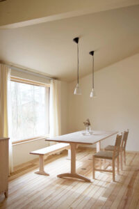 道産カバの床材とライムストーン、そして白い紙クロス、全体的に白系で統一されたシンプルな空間に、選び抜かれた調度品が置かれる平屋の一棟。 どの部屋の窓からも緑が切り取られるところがこの地域ならではの贅沢です。 道路側にはドッグランを設け、周りの木々が成長して、この平屋の家が隠れるようになっていくのが楽しみです。